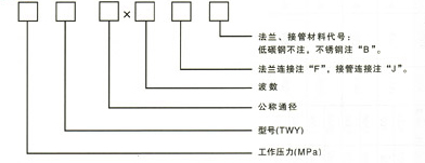 表示:公稱通徑為500mm,工作壓力為0.6MPa(6kg/cm2)波數(shù)為8個(gè),不銹鋼管連接的軸向型外壓式波紋補(bǔ)償器。