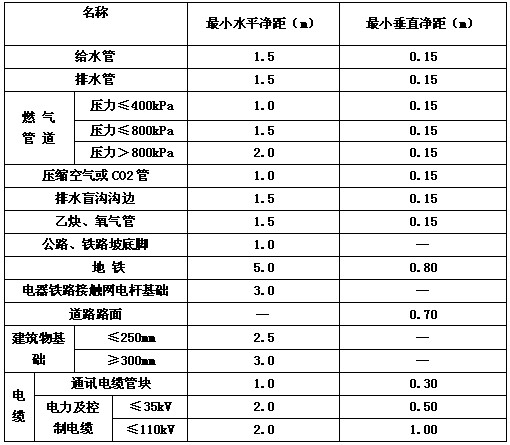 1.直埋供熱管道的布置應(yīng)符合_現(xiàn)行標(biāo)準(zhǔn)的有關(guān)規(guī)定。管道與有關(guān)設(shè)施的相互水平或垂直凈距應(yīng)符合下表的規(guī)定。