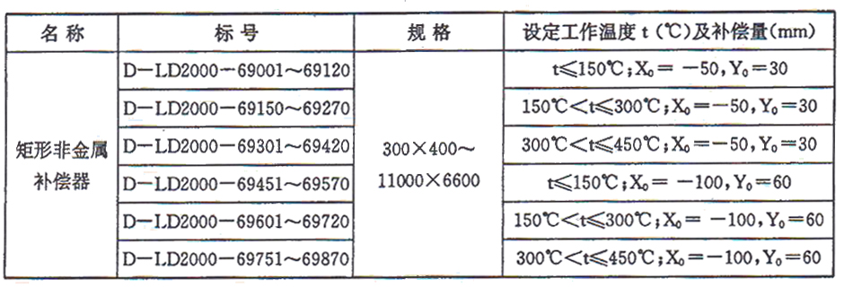 矩形非金屬補償器根據(jù)不同的工作溫度和補償量進行分類,編目如下:
