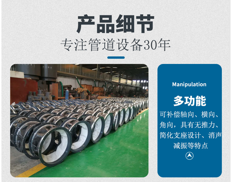 3、非金屬膨脹節(jié)用于消聲減振:纖維織物、保溫棉體本身具有吸聲、隔震動(dòng)傳遞的功能,能有效的減少鍋爐、風(fēng)機(jī)等系統(tǒng)的噪聲和震動(dòng)。